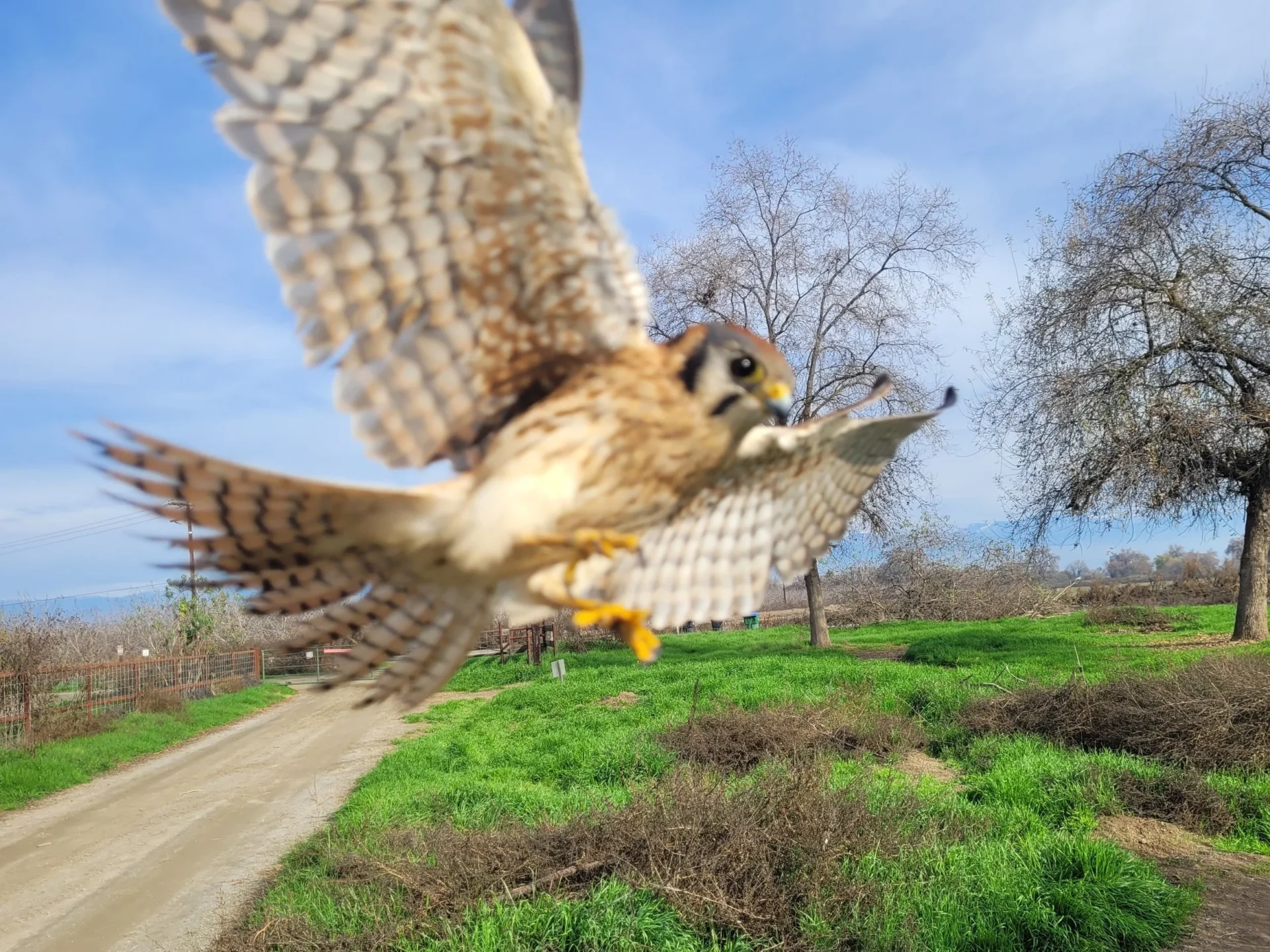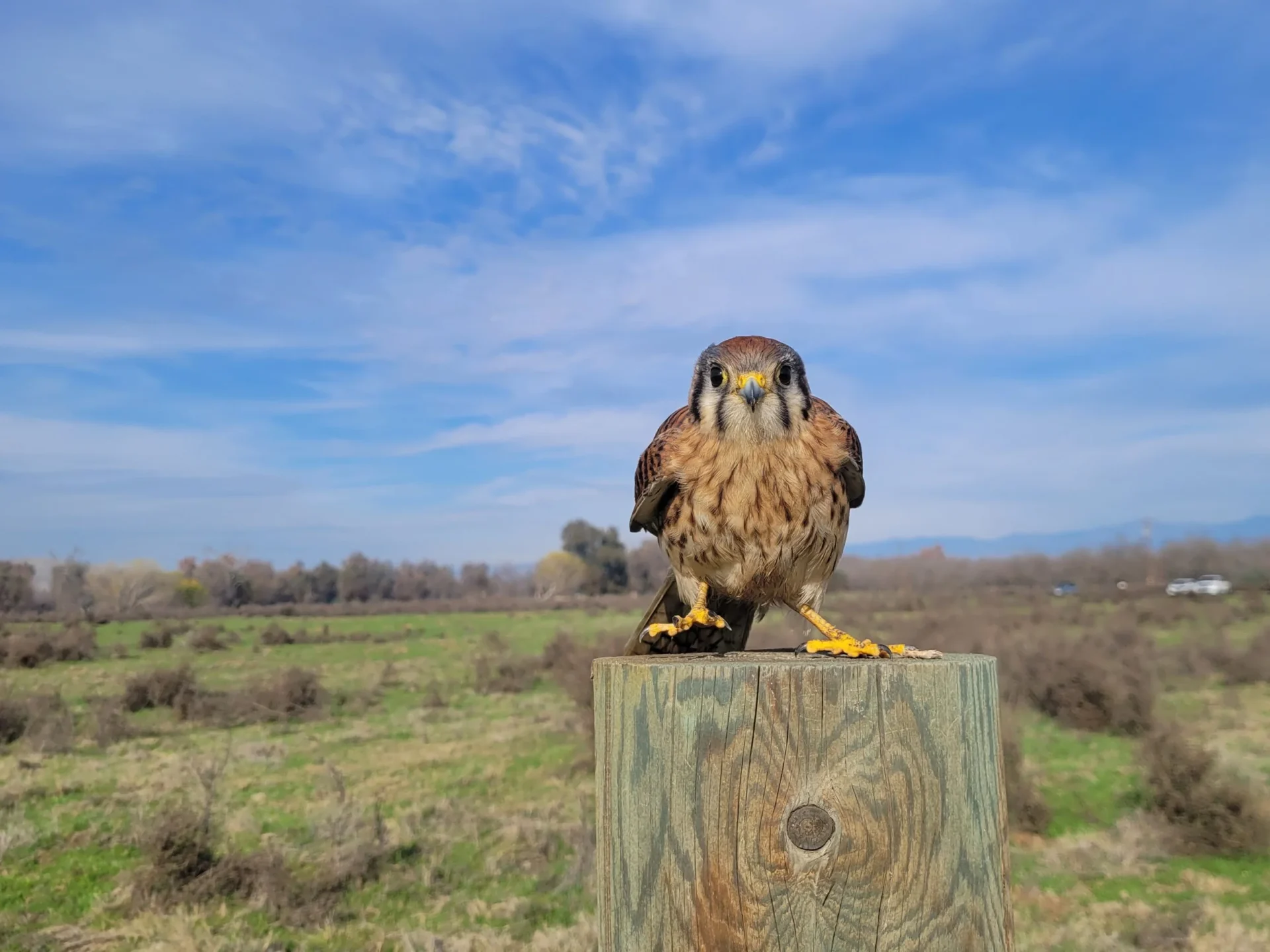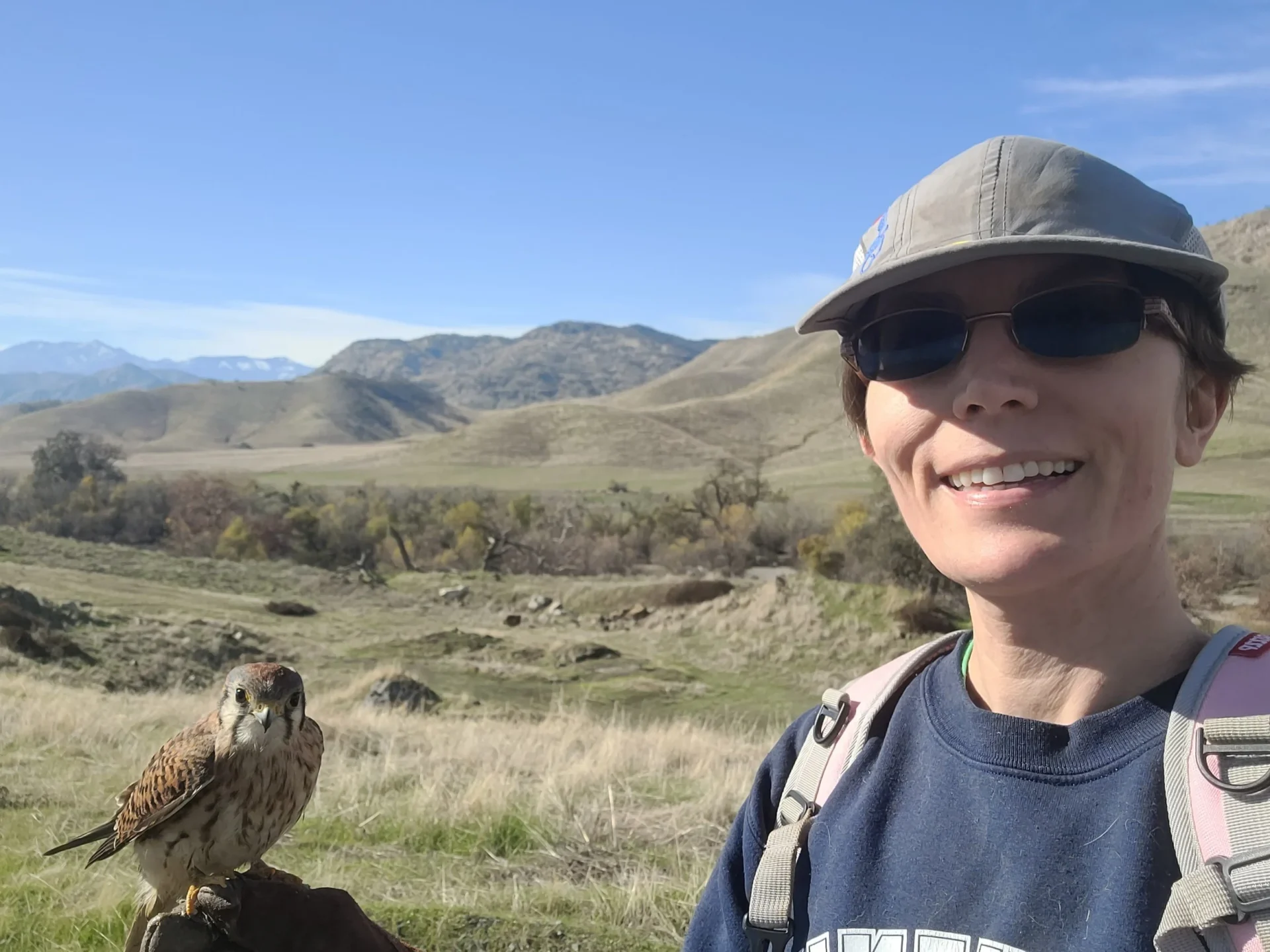 At Kaweah Oaks, Alvarado was flying Billie, who was spanning quite large distances looking for prey. “Periodically I called her back to me. Many falconers fly their birds with jesses (leather straps on the feet) or a telemetry unit in case they go out of your sight, but I did not have any equipment on her since I eventually wanted to release her again anyway, and I wanted to be sure that if she decided to leave she would not have any type of equipment on her that could create a hazard. She is quite small, and we lost sight of her for a bit,” Alvarado said. Then, she and her boyfriend saw that Billie had landed atop a fence post near a family out on a hike. “The family stopped and took photos of her and appeared quite surprised by this tame bird. Later on in the parking lot we chatted and explained that she is a trained falconry bird,” which helped the family understand the bird’s behavior.